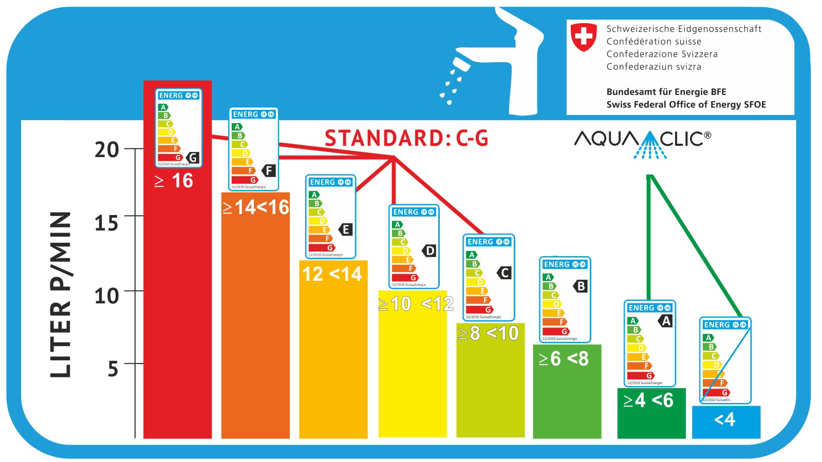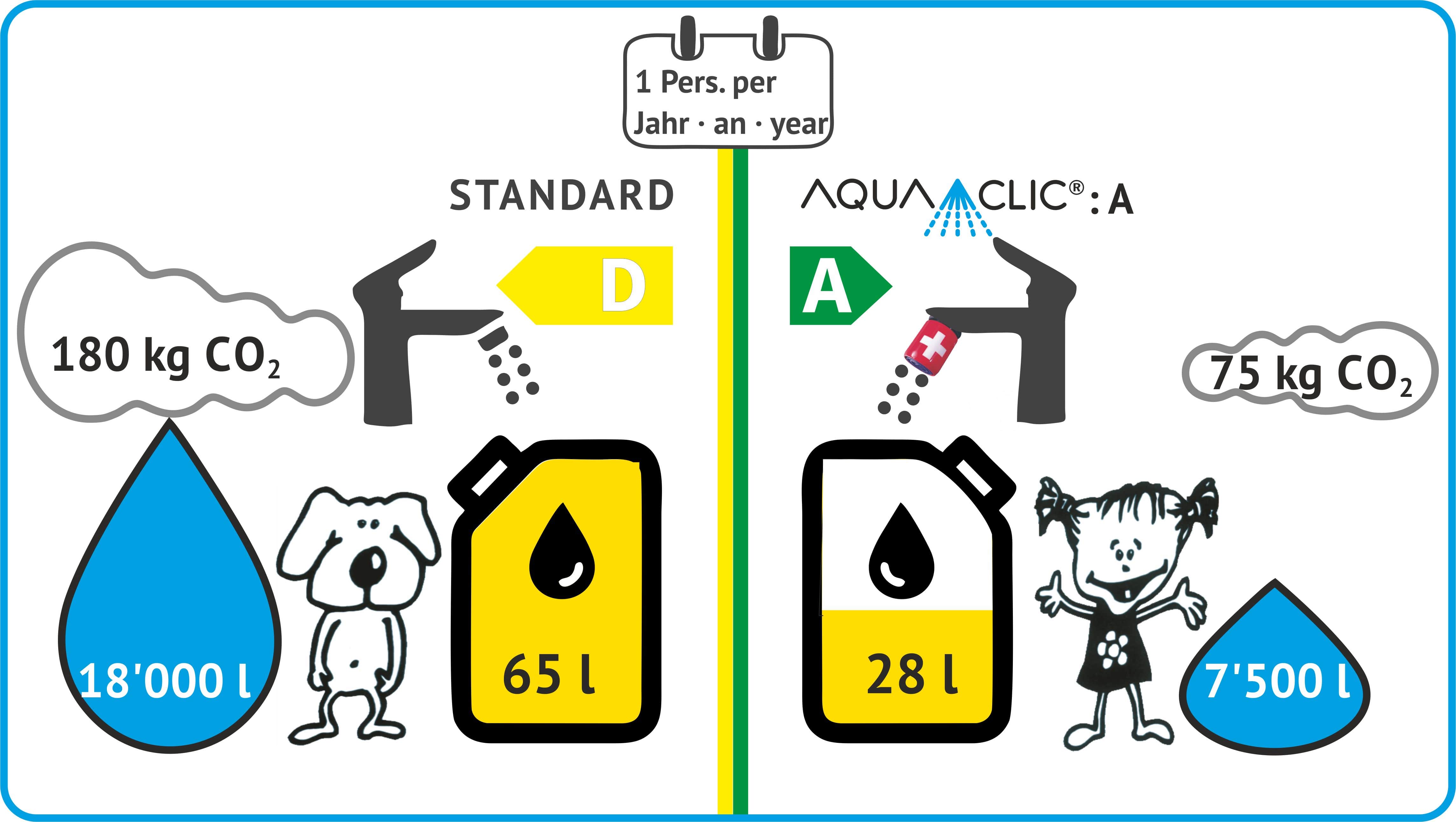 Der AquaClic Durchflussbegrenzer Excuses don't burn calories verbraucht nur 5 Liter in der Minute statt ca. 12 Liter Wasser bei einem ungeregelten Hahn.