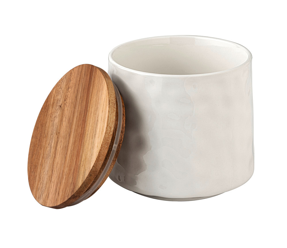 Die elegante Aufbewahrungsdose Adelle ist aus hochwertiger weißer Keramik gefertigt und mit einem natürlichen Akazienholz-Deckel versehen. Der Silikon-Dichtungsring sorgt für eine optimale Abdichtung und Frische Ihrer Küchenaufbewahrung.