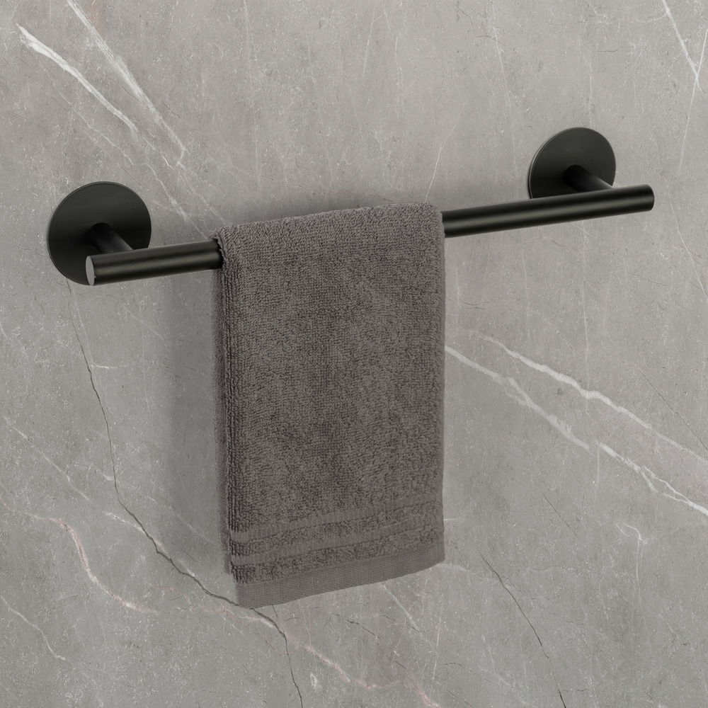 Der schwarze Wand-Handtuchhalter mit einer Länge von 40 cm besteht aus rostfreiem Edelstahl und besticht durch seinen zurückhaltend eleganten Look mit runden Montageplatten.