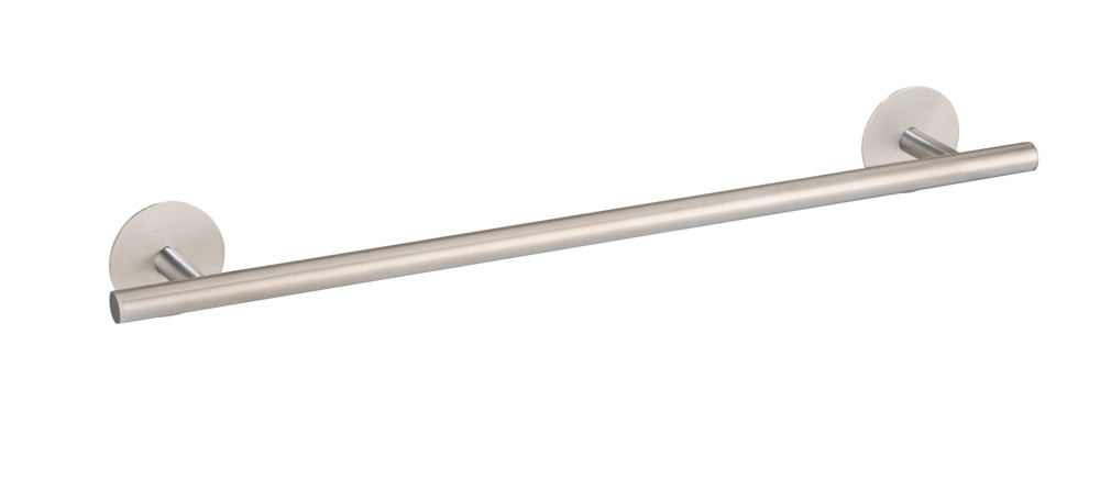 Der Wand-Handtuchhalter mit einer Länge von 60 cm besteht aus rostfreiem mattiertem Edelstahl und besticht durch seinen zurückhaltend eleganten Look mit runden Montageplatten.