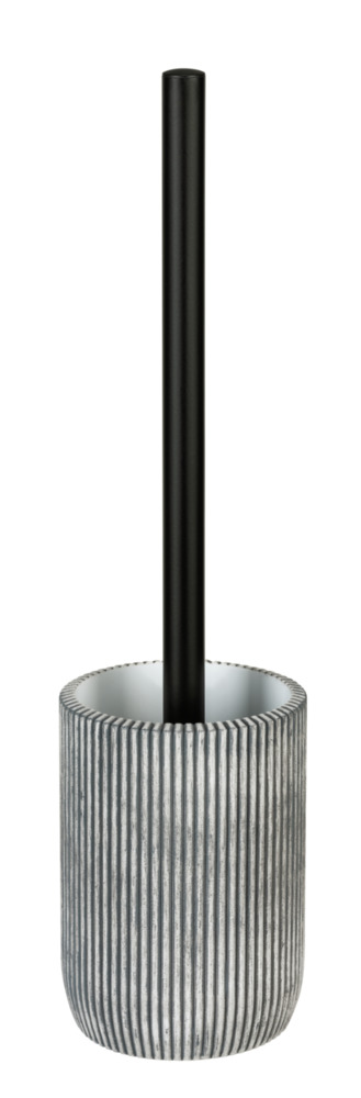 Die WC-Garnitur beinhaltet eine WC-Bürste mit einem schwarzen Edelstahlstiel. Der Bürstenkopf ist aus robustem schwarzem Kunststoff gefertigt und gewährleistet eine gründliche Reinigung. Mit der schwarzen Kunststoffabdeckung oberhalb der WC-Bürste bleibt das Innere des Bürstenhalters diskret verborgen. Insgesamt misst die Garnitur (B/T x H): Ø 9,5 x 37 cm.