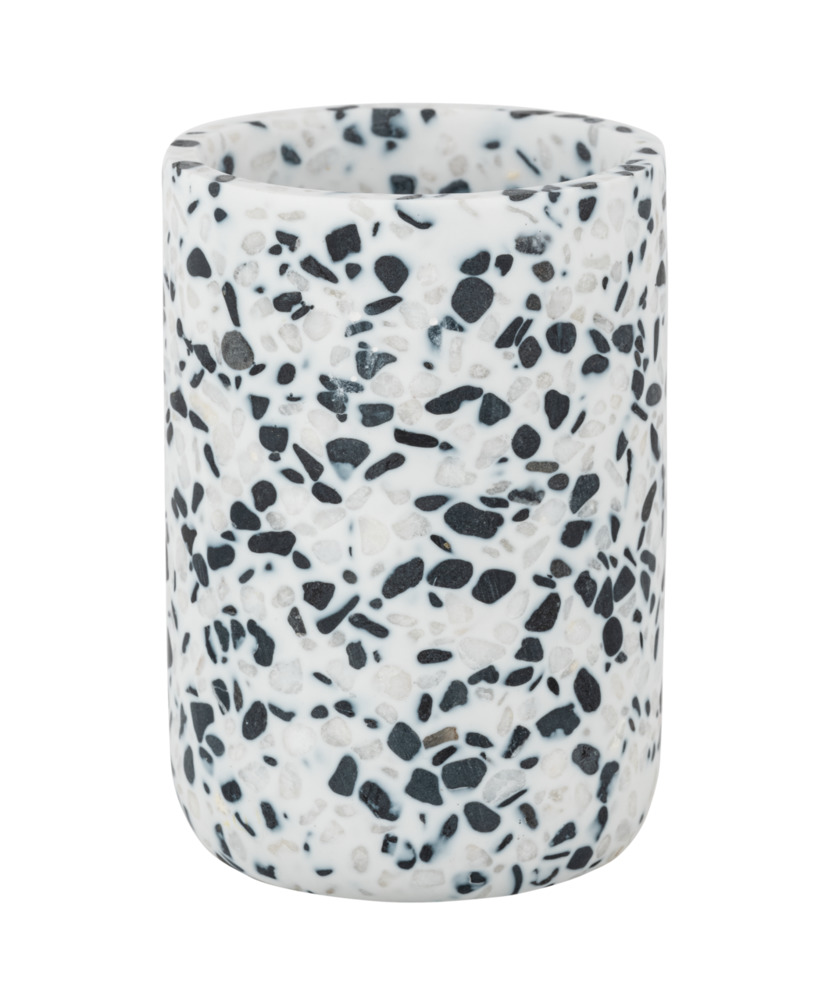 Antikes Design für die Neuzeit: Das 3-teilige Bad-Accessoire Set Tosi aus robustem Polyresin besteht aus einer WC-Garnitur, einem Seifenspender und einem Zahnputzbecher. Das ansprechende Terrazzo-Muster schätzten schon die alten Römer. Es bringt mediterranes Flair ins Bad und hält sich durch seine schwarz-weiße Farbgebung mit natürlichen Momenten jedoch stets elegant zurück.
