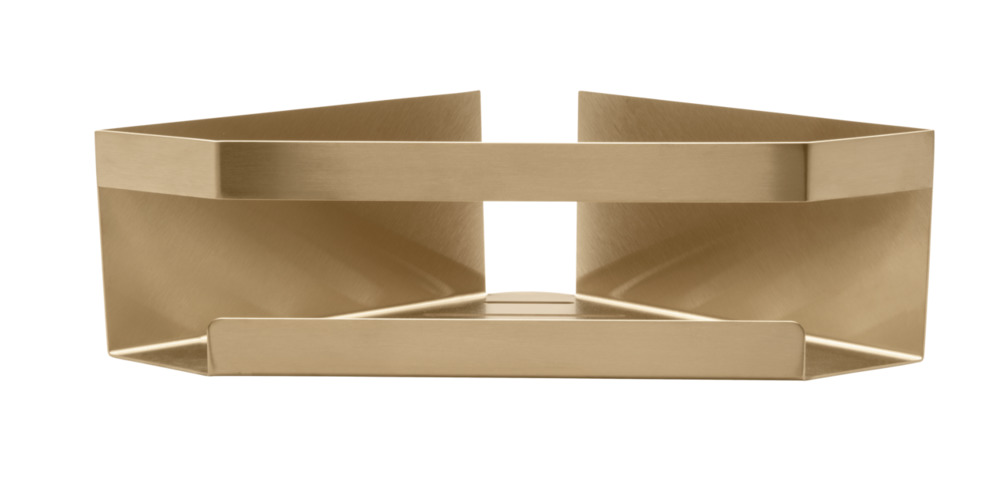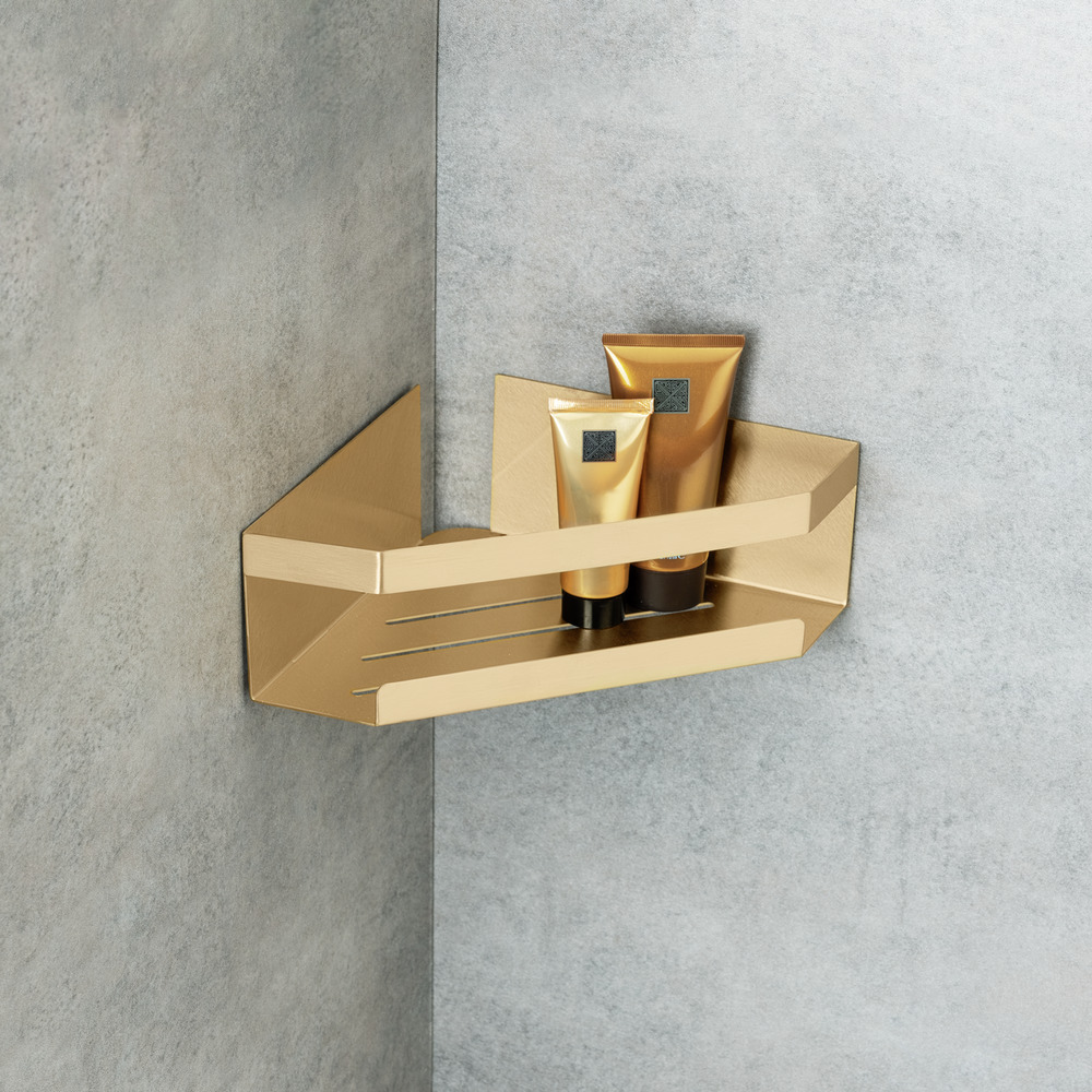 Die Eckablage Meleto aus rostfreiem Edelstahl in goldener Ausführung verleiht ungenutzten Ecken im Duschbereich einen klassisch-eleganten Look.