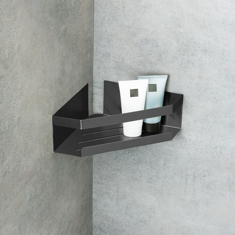 Die Eckablage Meleto aus rostfreiem Edelstahl in der Trendfarbe Gun-Metal Grey verleiht ungenutzten Ecken im Duschbereich einen extra modernen Look.