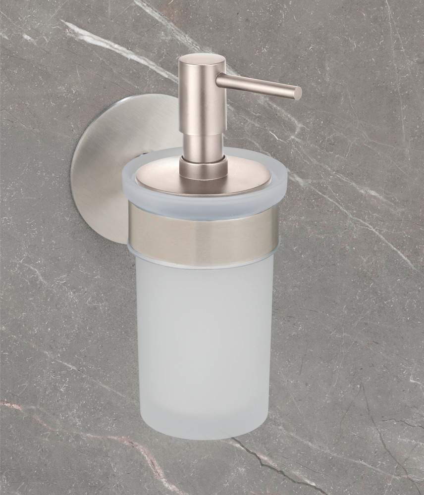 Der nachfüllbare Spender aus satiniertem Glas mit schwarzem Pumpkopf findet in der eleganten Halterung aus rostfreiem Edelstahl einen sicheren Platz.