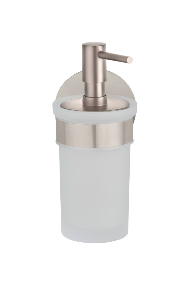 Der Seifenspender Meleto aus rostfreiem Edelstahl in silber und satiniertem Glas kann komfortabel in der Nähe des Waschbeckens platziert werden, wo er Flüssigseife oder Lotion bereithält.