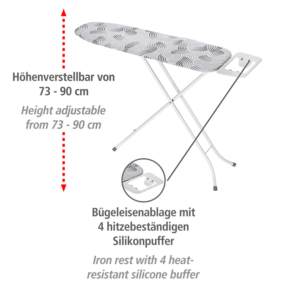 Durch die Höhenverstellbarkeit von 73 cm bis zu 90 cm lässt das Bügelbrett sich individuell anpassen, um den Rücken zu schonen.
