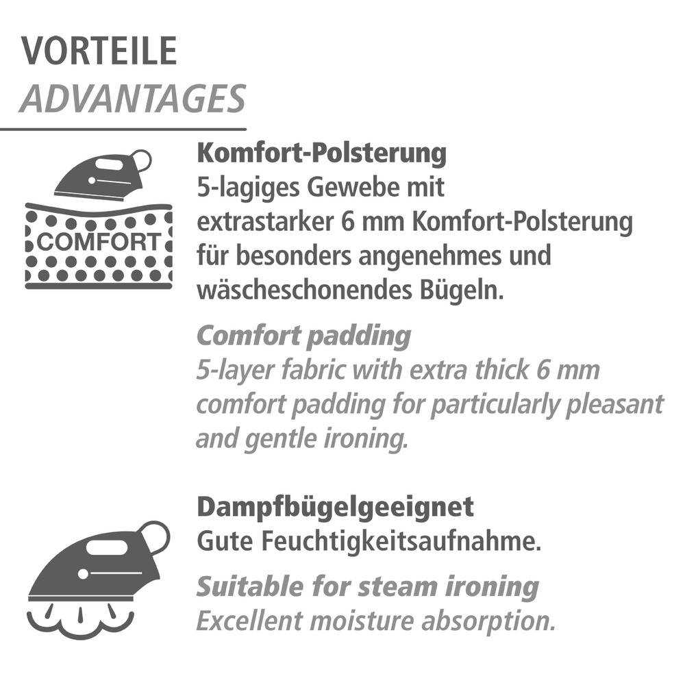 Im Inneren des Bügelbrettbezugs sorgt eine Polsterung aus Moltongewebe für die ideale Aufnahme von Hitze und Dampf, sodass er auch für den Einsatz von Dampfbügeleisen bestens geeignet ist.