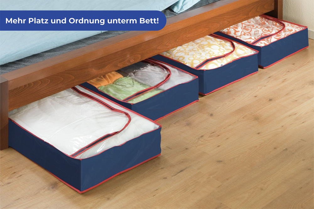 Mit den blau-roten Unterbettkommoden lassen sich Saisontextilien stets griffbereit und platzsparend unter dem Bett oder auf dem Schrank aufbewahren. Weder Staub noch Motten gelangen so an die Kleidung.