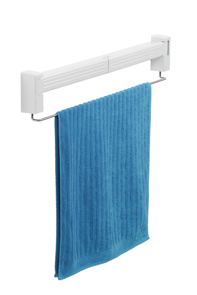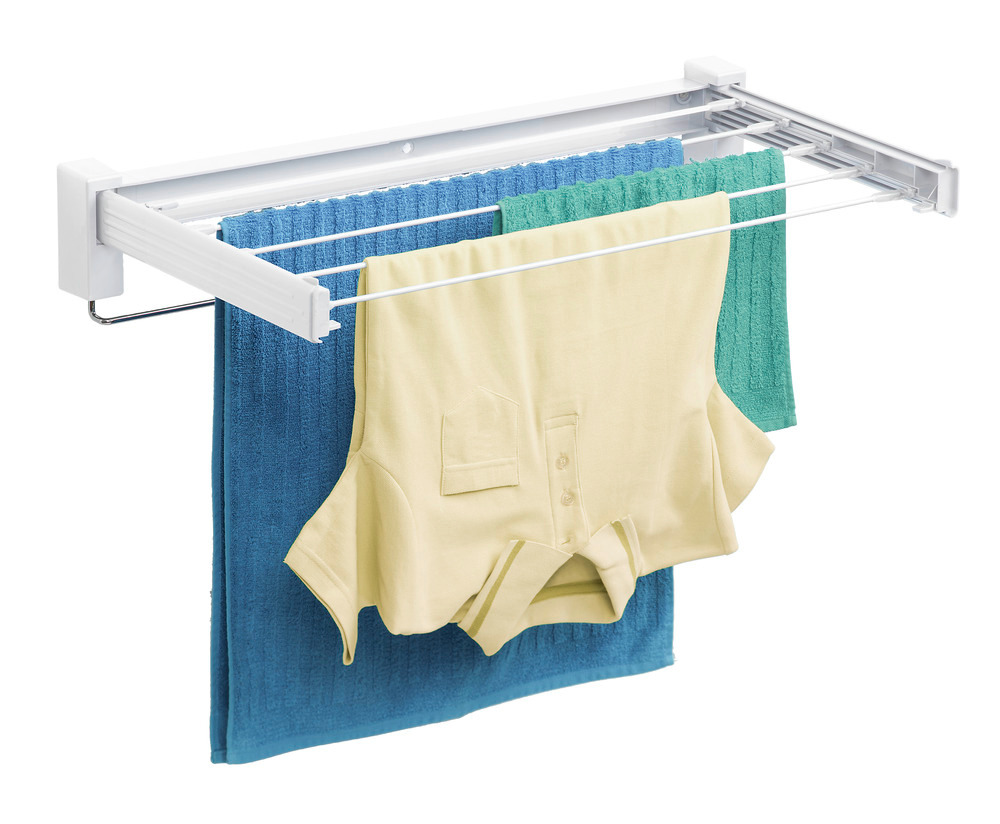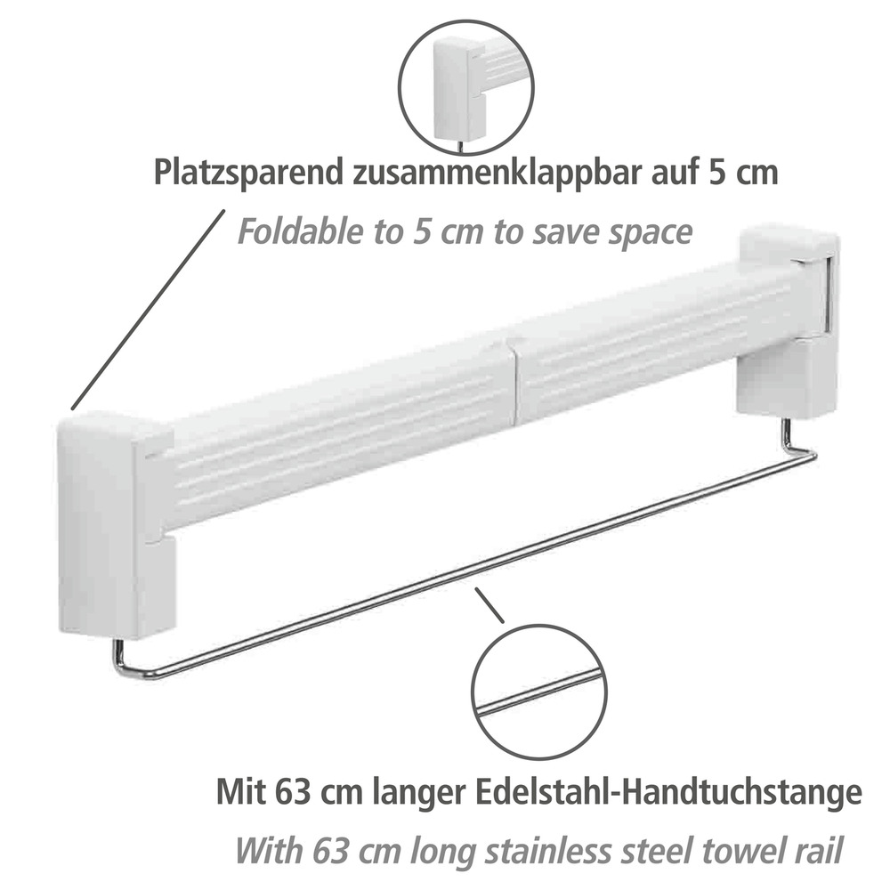 Der zusammengeklappte Wäschetrockner hat dann nur noch eine Tiefe von 5 cm. Unter dem ausklappbaren Teil des Trockners ist zusätzlich eine Edelstahl-Handtuchstange mit einer Länge von 63 cm angebracht.