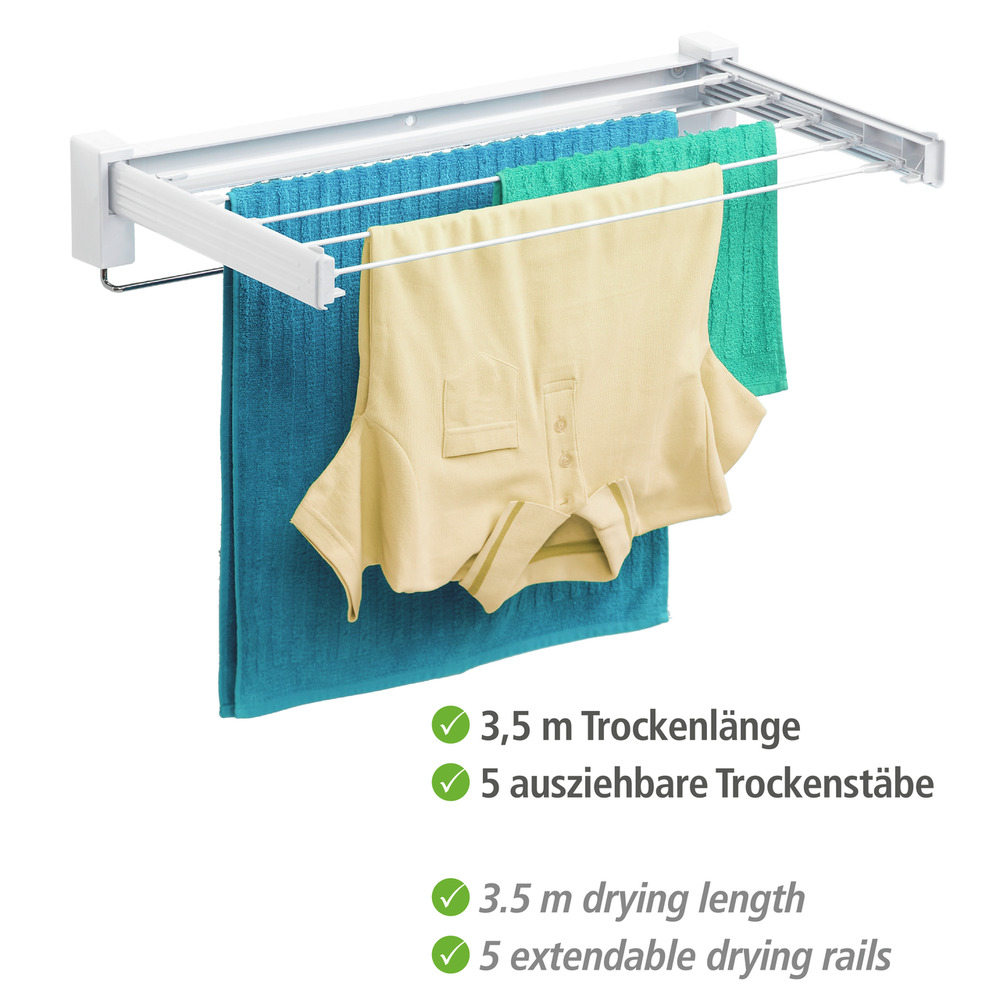 Fünf nach vorn ausziehbare Trockenstäbe zu je 57,5 cm bieten viel Platz zum Wäschetrocknen. Die kunststoffummantelten Stahl-Trockenstäbe sind nach Gebrauch wieder versenkbar, sodass die Stäbe nicht verschmutzen.