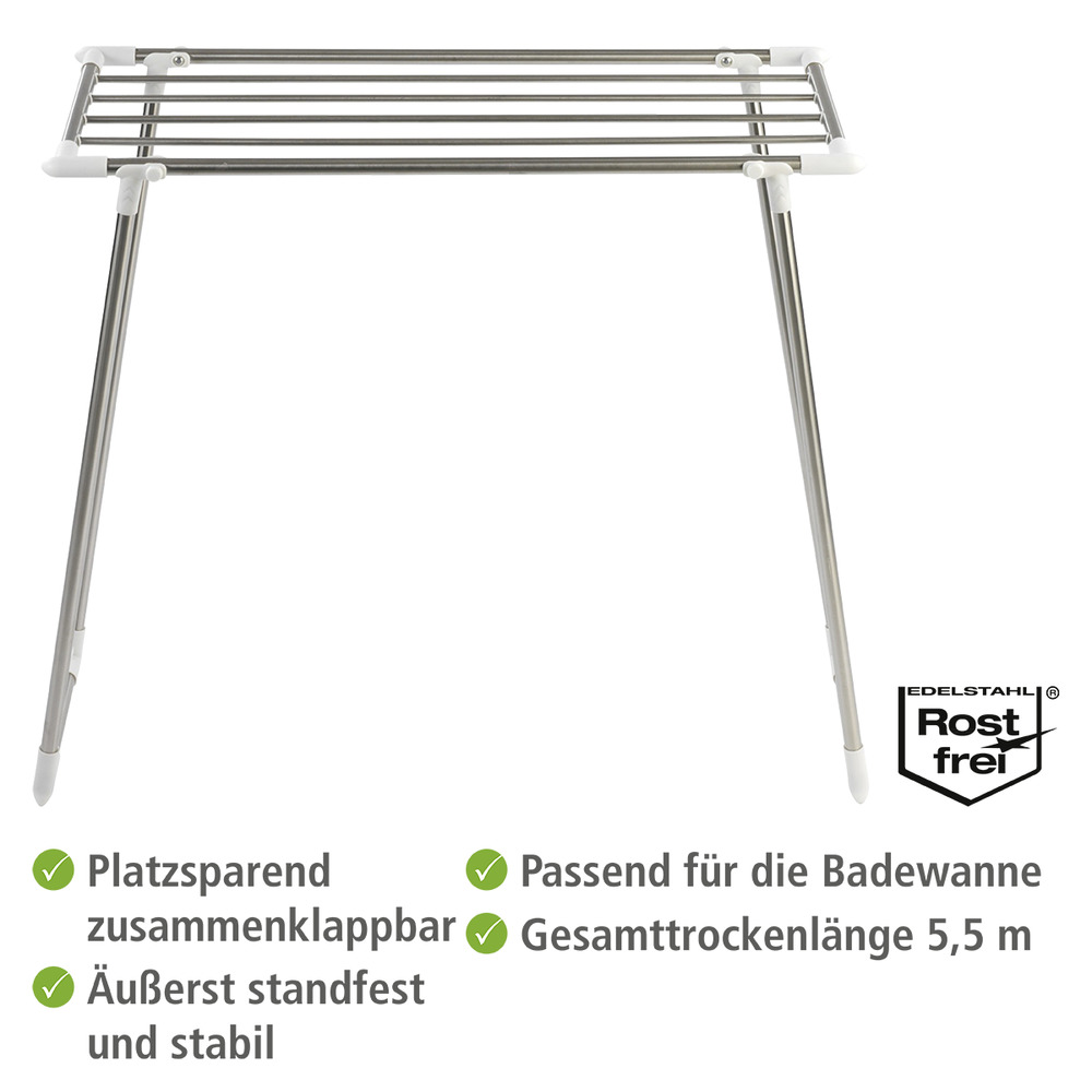 Dank der breiten Streben kommt es beim Trocknen zu weniger Abdrücken auf den Textilien. Der glatte Edelstahl sorgt für eine schonende Aufhängung und unterstützt die Langlebigkeit der Wäsche.