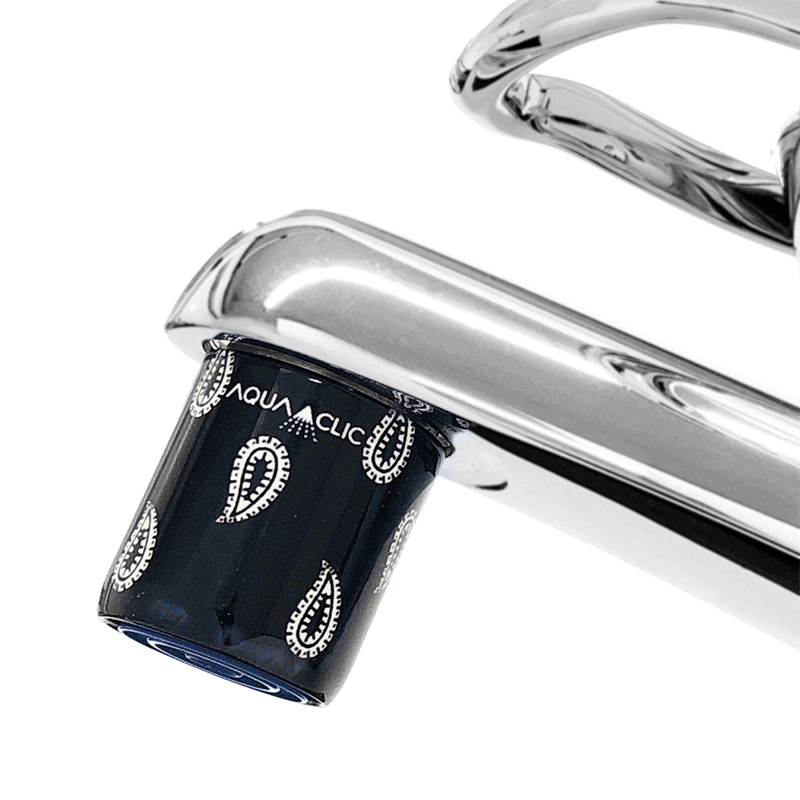 Der AquaClic Strahlregler Glarner Tüechli in schwarz aus Messing verbraucht nur 5 Liter in der Minute statt ca. 12 Liter Wasser bei einem ungeregelten Hahn.