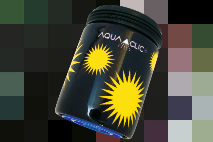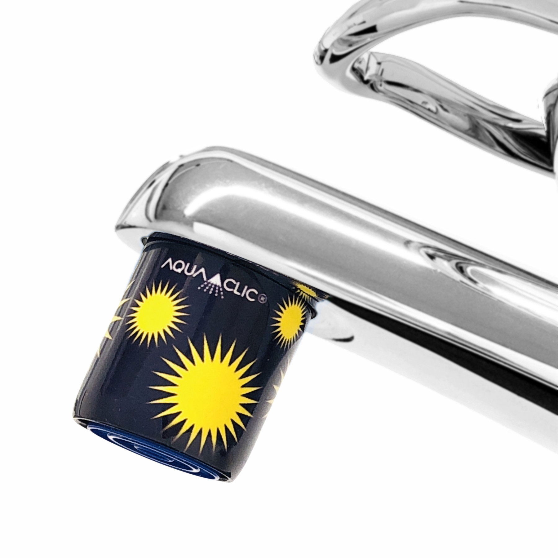 Der AquaClic Durchflussbegrenzer Soleil Soleil aus Messing verbraucht nur 5 Liter in der Minute statt ca. 12 Liter Wasser bei einem ungeregelten Hahn.